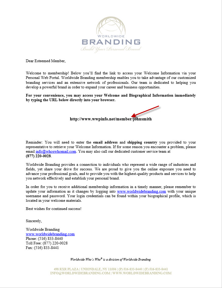 A: No. Your welcome information will arrive by email. Please be certain that you have added the approved email address: info@whoswhomail.com. If you provided your new membership representative with a mailing address, then you will also receive a postcard directing you to your personal URL for quick access to your welcome information.